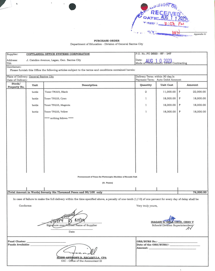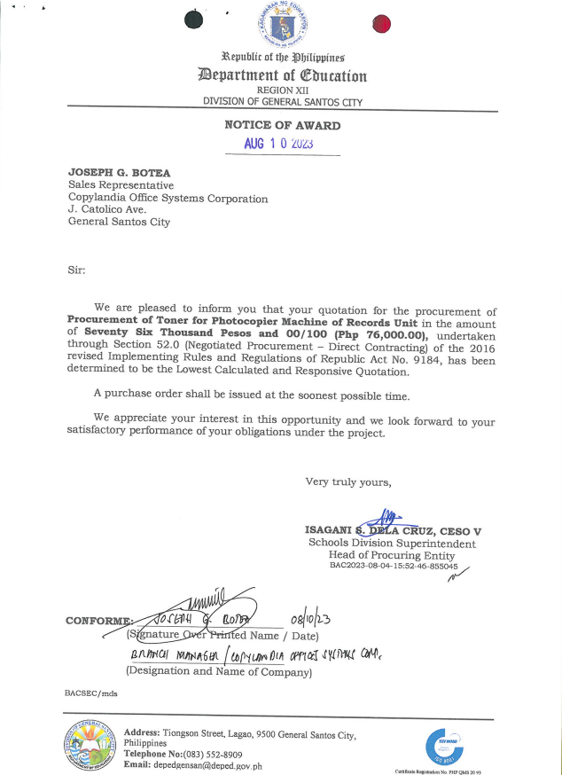 Notice of Award: P.O. 2023-07-147 Procurement of Toner for Photocopier Machine of Records Unit
