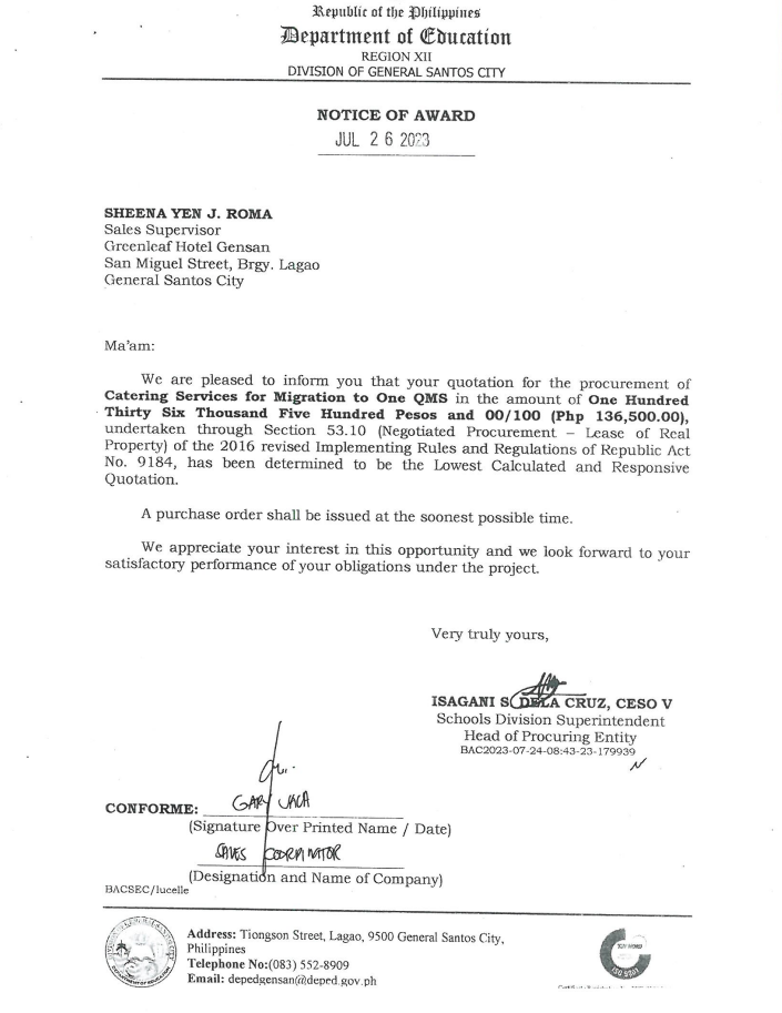 Notice of Award: P.O. 2023-07-135: Catering Services for Migration to One QMS
