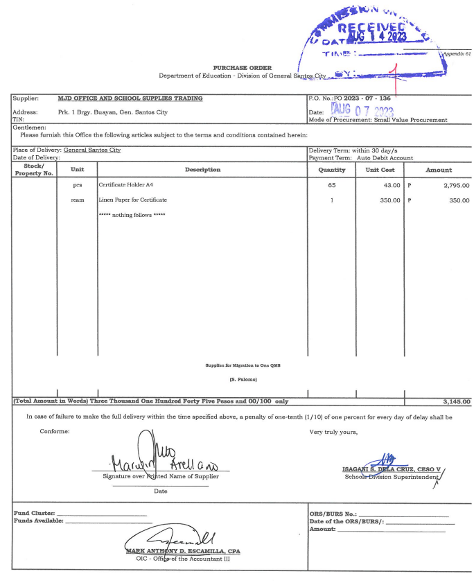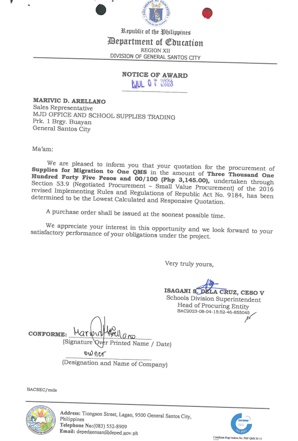 Notice of Award: P.O. 2023-07-136: Supplies for Migration to One QMS