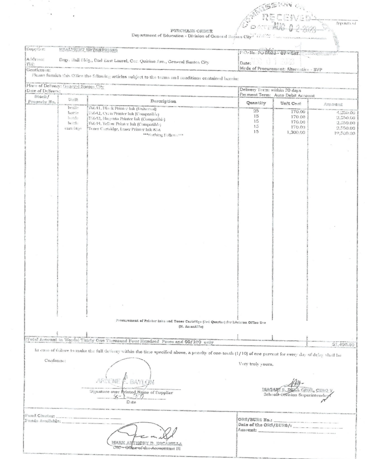 Notice of Award: P.O. 2023-07-137: Procurement of Printer Inks and Toner Cartridge (1st Quarter) for Division Office Use