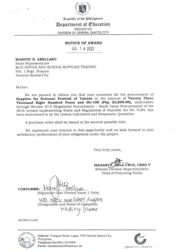 Notice of Award: P.O 2023-07-1 …