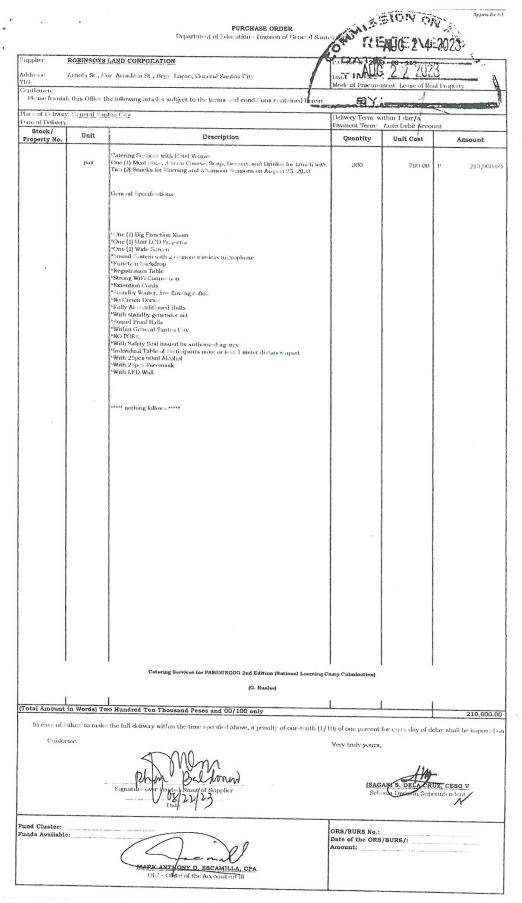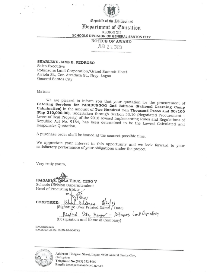 Notice of Award: P.O. 2023-08-159 Catering Services for PASIDUNGOG 2nd Edition (National Learning Camp Culmination)