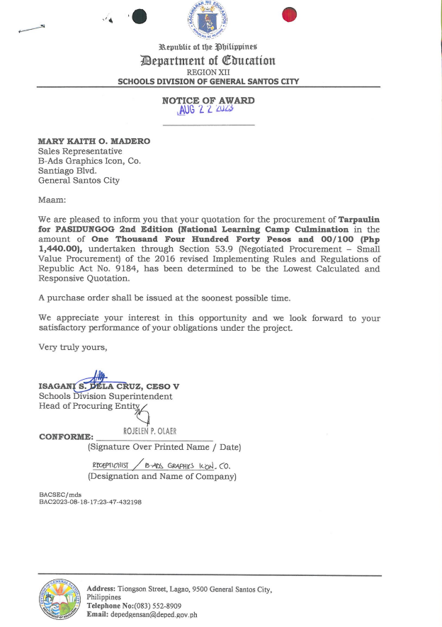 Notice of Award: P.O. 2023-08-161 Tarpaulin for PASIDUNGOG 2nd Edition (National Learning Camp Culmination)