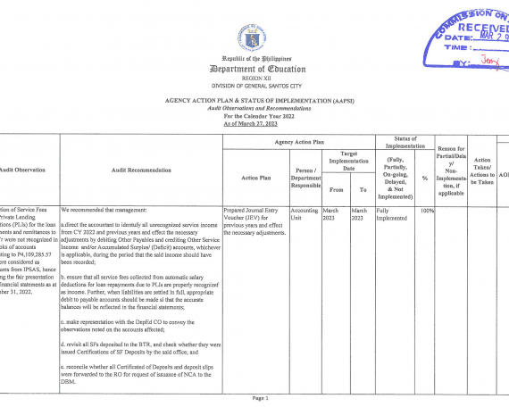 AGENCY ACTION PLAN & STATUS OF IMPLEMENTATION (AAPSI)